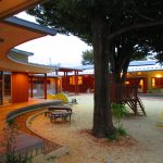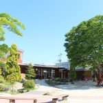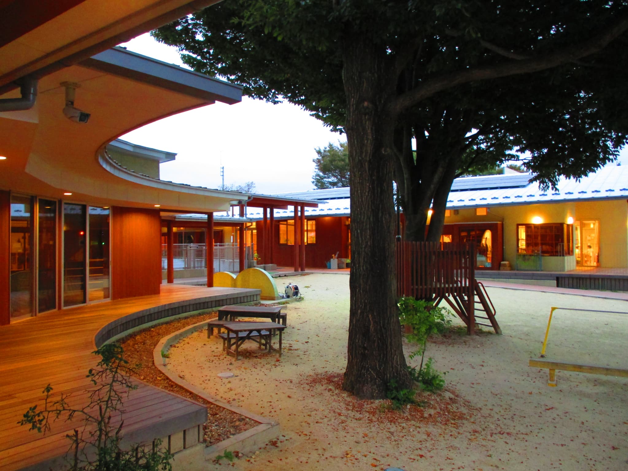 1955年開園。2015年に幼保連携型認定こども園ぶどうの木となりました。ホールを挟んで、0~2歳児棟、3~5歳児棟がテラスでつながっています。園庭にある3本の大木が、そこに集う子どもたちや職員を見守ります。